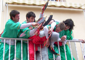 Tudela, que fue dominio de la Orden Hospitalaria de San Juan de Jerusalén y que históricamente fue lugar fronterizo entre cristianos y musulmanes. Como dicen sus gentes, resulta curioso, por tanto, que el protagonista de los festejos del domingo de Ramos sea un judío, aquel que la tradición atribuye la traición de Cristo: Judas Iscariote. Dicen que la Tradición arranca en 1891… Y ahora os lo cuentan los mismo vecinos que escriben en la red del pueblo sobre estas cosas tan ancladas en la tradición y no ajenas a la presencia en el lugar de una orden militar poderosa. Leamos cómo nos cuentan que «el escenario es la plaza del Ayuntamiento, donde se reúne el millar y medio de vecinos para los dos actos que protagonizan el día. El primero es la llamada Procesión del Encuentro, durante la cual una niña vestida de ángel le anuncia a la Virgen María la buena nueva de la Resurrección de Jesús. A continuación, a las 13:00 aproximadamente, llega el momento más esperado y divertido. Los jóvenes se disfrazan de legionarios romanos y, acompañados de cinco vestales, suben al balcón del consistorio, desde donde el capitán ordena la captura de Judas. Éste es interpretado por algún mozo del pueblo vestido con un traje rojo y plateado y una malla en la cabeza, que debe huir de una decena de perseguidores. Para ello corre, salta a los balcones,