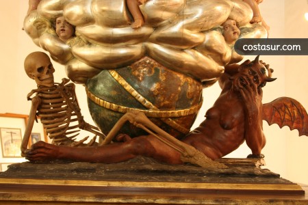 A lo largo del recorrido, la procesión penetra en la Catedral pero no el paso de la Diablesa que lo tiene prohibido y que da la vuelta por las calles que la rodean hasta que la procesión vuelve a salir encabezada, por cierto, por el Caballero Cubierto que además de sombrero lleva en sus manos el pendón negro, insignia de la procesión. Le siguen cientos de hombres alumbrantes y el paso de San Juan Evangelista, obra barroca, y detrás de él La Diablesa. Por cierto, esta procesión se cierra con la imagen de la Soledad enlutada, la misma que describió Gabriel Miró en su conocida obra “El obispo leproso”. Un conjunto digno de contemplarse que saldrá hoy sábado santo a las siete y media de la tarde a las calles de Orihuela.
