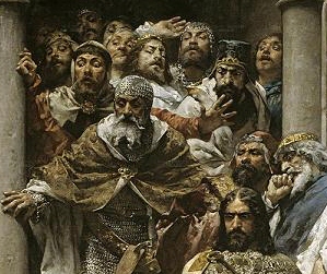 En Facebook decía también que el óleo, que representa el momento en el que el rey Ramiro II el Monje, quinto rey de Aragón en el siglo XII está enseñando a la corte la campana hecha con las cabezas de los nobles y gobernantes rebeldes a la Corona. Y también que está en el Ayuntamiento de Huesca, que lo pintó José Casado del Alisal en diciembre de 1874, presentándose al público en 1880. En él aparecen sólo 13 cabezas cortadas, 12 en círculo en el suelo y una decimotercera colgada de badajo con una cuerda, precisamente cargaban las tintas los literatos -sin base histórica- adjudicando ésta al obispo de Huesca.