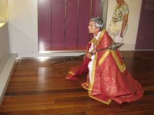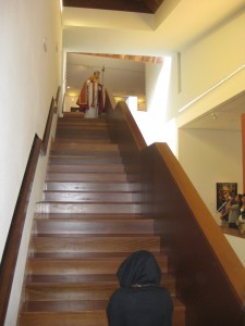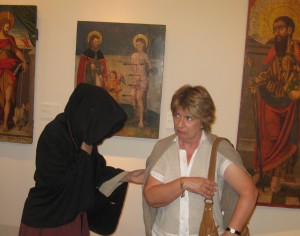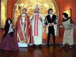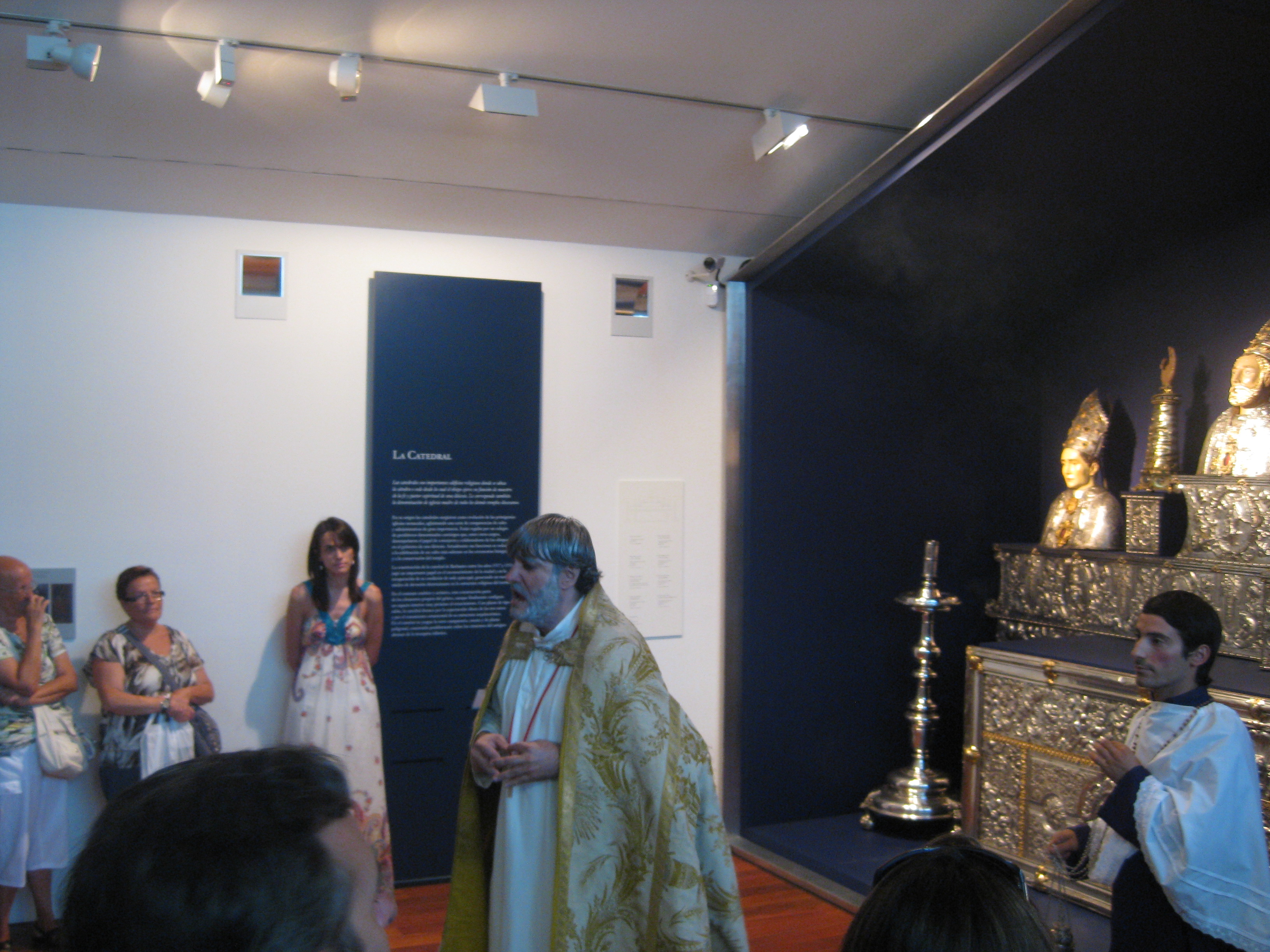 Y después de esta incursión por el espacio catedralicio, llegamos al Museo y comenzamos una apasionante visita contando con una guía de excepción, María Puértolas, de cuya acertada y sabia mano comenzamos el recorrido. Pero nos acompañaron desde el principio otras personas, del pasado, que se iniciaron con la figura solemne del primer obispo de la diócesis recreada a finales del siglo XVI, por el abad de San Victorián que estuvo sencillamente magnífico, por una pobre mujer que busca ayuda en la habitual enfermedad del mundo moderno, por un obispo dieciochesco y por el pintor Pedro García de Benabarre. El resultado fue magnifico, el rato que pasamos estupendo, el montaje de la ambientación teatral y de los guiones soberbio.